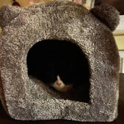 Soft teddy bear plush cat bed with a modern design, non-slip base, and cosy comfort. Available in brown or grey.