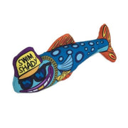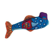 Fish-shaped Fat Cat Catch of the Day toy packed with organic catnip. Durable canvas and perfect for bunny kicks, wrestling, and play.