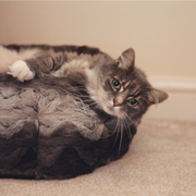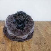 Stylish grey & cream snuggle plush oval bed with soft luxury lining. Modern, machine washable, perfect for cats & small dogs.