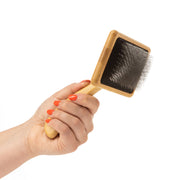 The Mikki Bamboo Soft Pin Slicker is a planet-friendly grooming essential designed for a safe, gentle, and effective grooming experience. Handmade from sustainable bamboo, this slicker brush features soft pins on an air-cushioned pad that follow the contours of your pet’s body, lifting dead hair, loosening tangles, and helping to reduce shedding without scratching the skin.