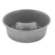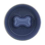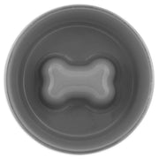 Slow-feed stainless steel bowl with raised bone to prevent gulping. Durable, rust-resistant, non-skid feet. Ideal for indoor & outdoor use.