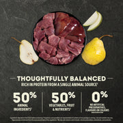 This recipe is made with free-run duck as the single animal protein, making it gentle on sensitive stomachs and perfect for picky eaters. WholePrey™ inclusions of meat, organs, and cartilage provide nutrients naturally, while pears, pumpkin, and squash deliver fiber and antioxidants for digestive health.