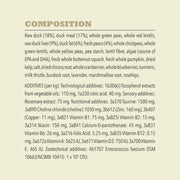 Fresh duck (18%), duck meat meal (17%), whole green peas, whole red lentils, fresh duck giblets (liver, heart, kidney) (7%), duck fat (6%), fresh Bartlett pears (4%), whole chickpeas, whole green lentils, whole yellow peas, dried duck cartilage (2%), lentil fibre, marine algae (1.2%) (source of DHA & EPA), fresh butternut squash, fresh pumpkin, dried kelp, freeze-dried duck liver (0.1%), salt, fresh cranberries, fresh blueberries, chicory root, turmeric root, milk thistle, burdock root, lavender, marshmallow root, rosehips, Enterococcus faecium.