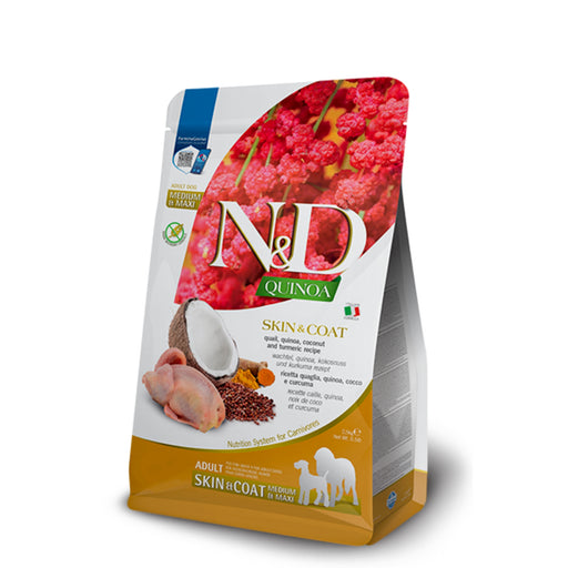 Farmina N&D Skin & Coat Quail Medium & Maxi is a complete, limited-ingredient diet designed to support skin and coat health in dogs wit...
