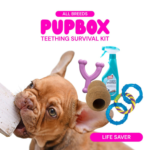 Our Teething Terror Survival Kit is specifically designed to help soothe sore gums and redirect chewing away from furniture and shoes.